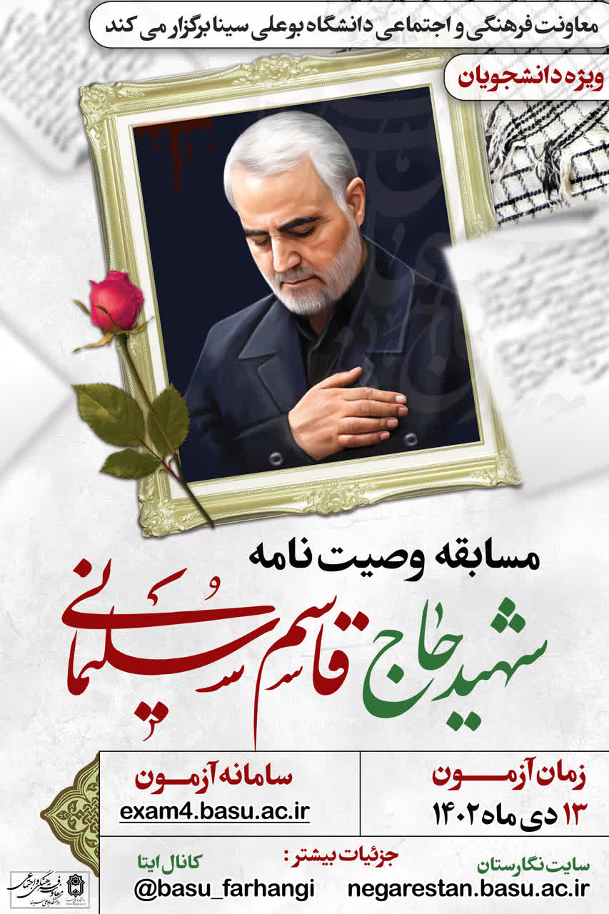 از روز اول تا سیزدهم دی ماه، هر روز بخشی از وصیت نامه حاج قاسم سلیمانی در کانال معاونت فرهنگی در ایتا ارائه خواهد شد و در نهایت در روز ۱۳ دی ماه، همزمان با سالروز شهادت سردار سرافراز اسلام، از بخشهای ارائه شده وصیت نامه شهید، آزمون گرفته خواهد شد. همچنین فایل کامل وصیت نامه در کانال معاونت در ایتا (@basu_farhangi) و سایت نگارستان در انتهای همین اطلاعیه (http://negarestan.basu.ac.ir) بارگزاری خواهد شد